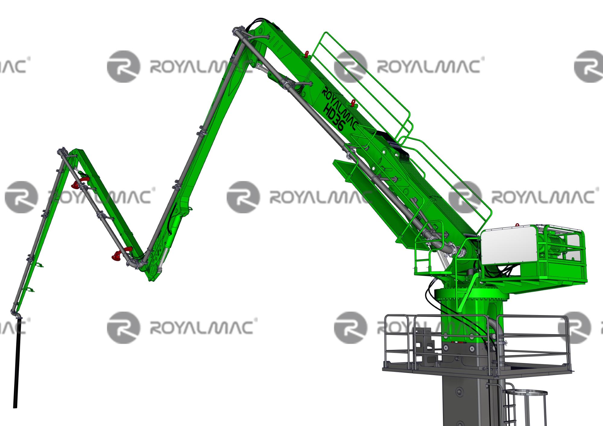 The Royalmac HD36 Self Climbing Concrete Placing Boom sets a new standard for concrete distribution in high-rise and large-scale projects. With its impressive 36-meter horizontal and 38-meter vertical reach, and a massive 4069m² working area, the HD36 maximizes efficiency for every floor. Featuring a 4-section ZR opening boom and a 4-meter end hose, precise and flexible concrete placement is guaranteed.